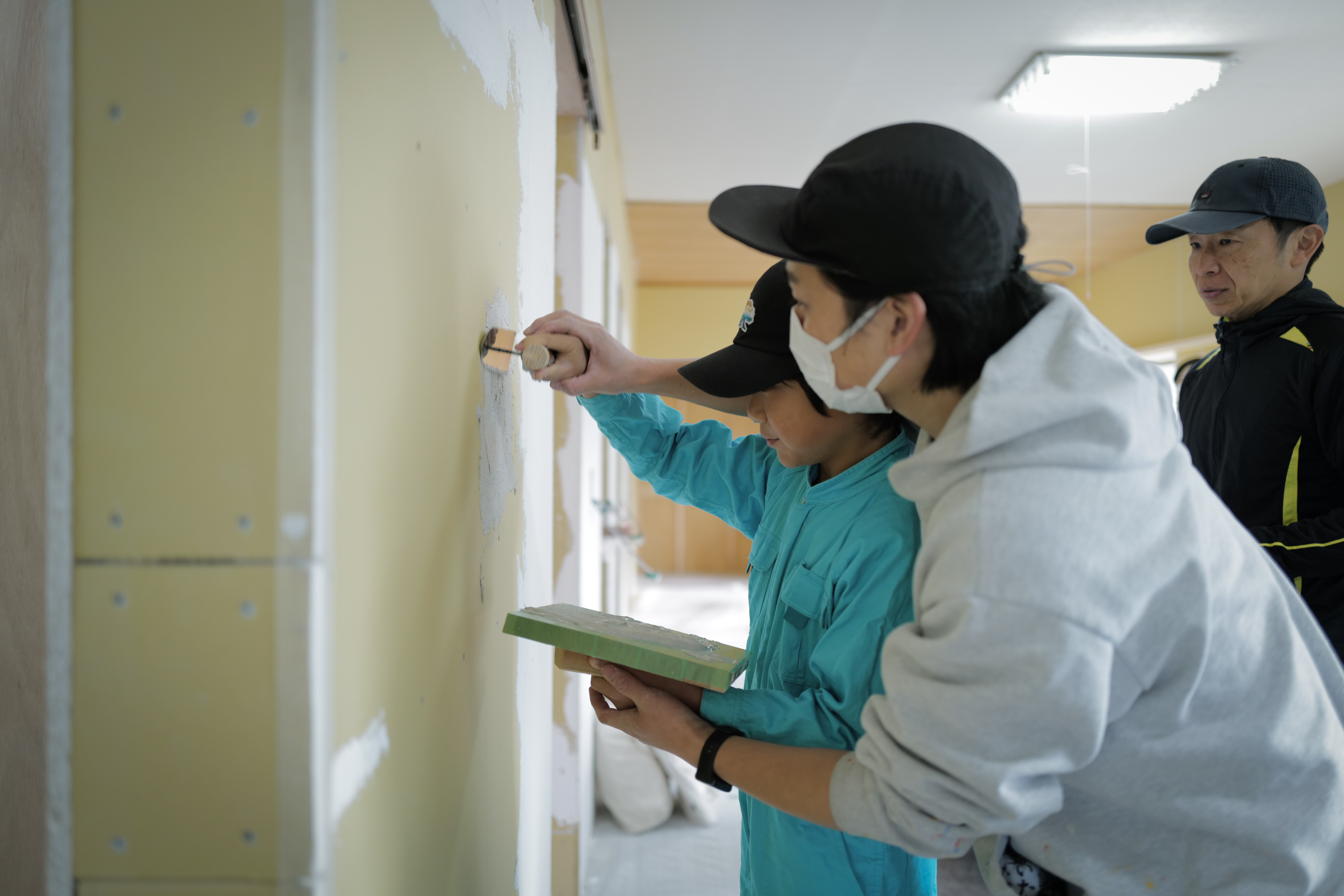 前回の壁づくり編にて参加者皆さんと施工した壁を、地元産の漆喰を使用して、壁塗りを実施しました!